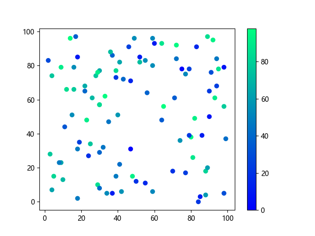 # 以下三行代码使编译器支持绘图功能: import sys import matplotlib matplotlib.use('Agg') import matplotlib.pyplot as plt import numpy as np # 生成随机数据: x = np.random.randint(100, size=(100)) y = np.random.randint(100, size=(100)) colors = np.random.randint(100, size=(100)) # 使用冬季 (winter) 配色方案创建散点图: plt.scatter(x, y, c=colors, cmap='winter') plt.colorbar() plt.show() # 以下两行代码使编译器能够输出图形: plt.savefig(sys.stdout.buffer) sys.stdout.flush()