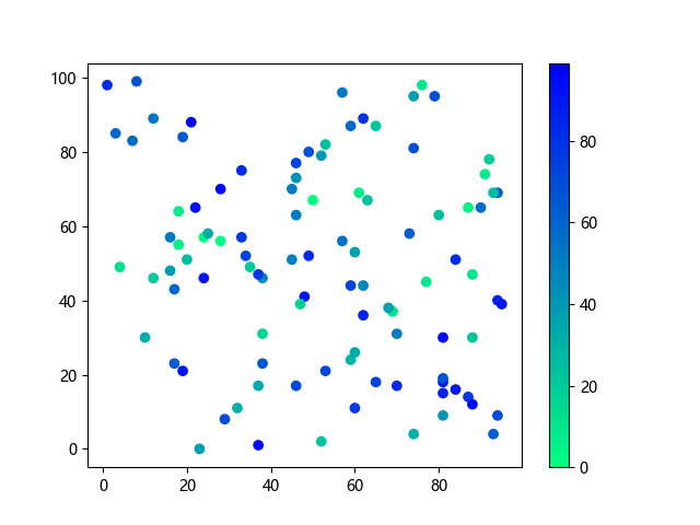 # 以下三行代码使编译器支持绘图功能: import sys import matplotlib matplotlib.use('Agg') import matplotlib.pyplot as plt import numpy as np # 生成随机数据: x = np.random.randint(100, size=(100)) y = np.random.randint(100, size=(100)) colors = np.random.randint(100, size=(100)) # 使用冬季反向 (winter_r) 配色方案创建散点图: plt.scatter(x, y, c=colors, cmap='winter_r') plt.colorbar() plt.show() # 以下两行代码使编译器能够输出图形: plt.savefig(sys.stdout.buffer) # 将图形保存到标准输出缓冲区 sys.stdout.flush() # 刷新输出缓冲区