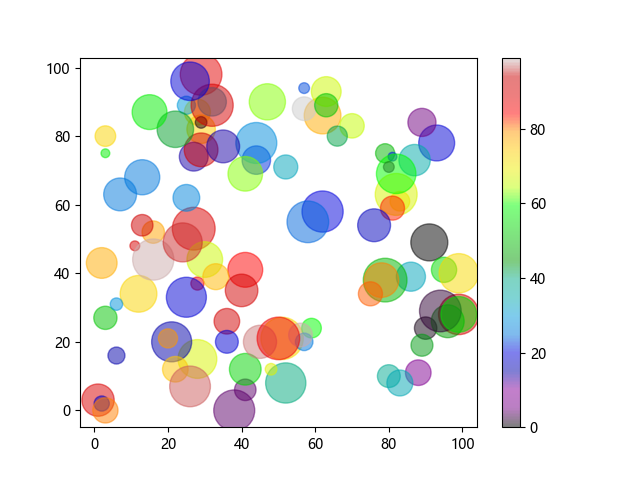 # 以下三行代码使编译器支持绘图功能: import sys import matplotlib matplotlib.use('Agg') import matplotlib.pyplot as plt import numpy as np # 生成随机数据: x = np.random.randint(100, size=(100)) y = np.random.randint(100, size=(100)) colors = np.random.randint(100, size=(100)) sizes = 10 * np.random.randint(100, size=(100)) # 点大小(10-990随机值) # 使用光谱配色、半透明效果创建散点图: plt.scatter(x, y, c=colors, s=sizes, alpha=0.5, cmap='nipy_spectral') plt.colorbar() plt.show() # 以下两行代码使编译器能够输出图形: plt.savefig(sys.stdout.buffer) sys.stdout.flush()