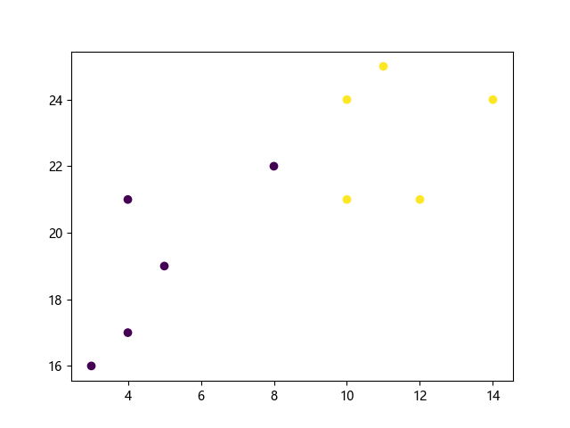 # 这三行代码使编译器能够绘图: import sys import matplotlib matplotlib.use('Agg') import matplotlib.pyplot as plt # 数据点坐标和类别标签: x = [4, 5, 10, 4, 3, 11, 14, 8, 10, 12] y = [21, 19, 24, 17, 16, 25, 24, 22, 21, 21] classes = [0, 0, 1, 0, 0, 1, 1, 0, 1, 1] # 绘制散点图(按类别着色): plt.scatter(x, y, c=classes) plt.show() # 这两行代码使编译器能够输出图形: plt.savefig(sys.stdout.buffer) sys.stdout.flush()