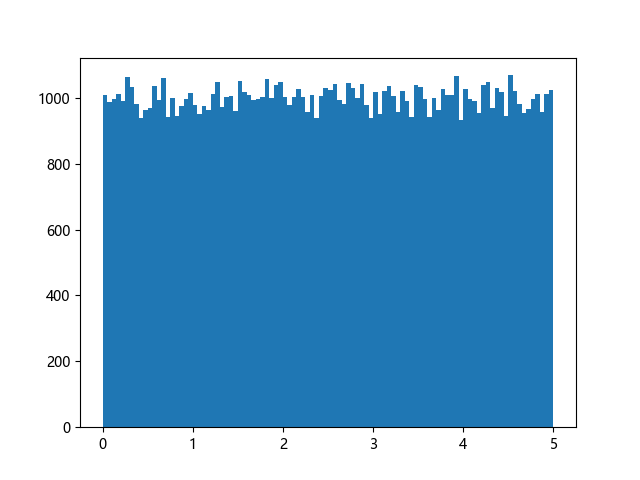 # 使编译器支持绘图的三行配置: import sys import matplotlib matplotlib.use('Agg') import numpy import matplotlib.pyplot as plt x = numpy.random.uniform(0.0, 5.0, 100000) plt.hist(x, 100) plt.show() # 实现编译器绘图功能的两行代码: plt.savefig(sys.stdout.buffer) sys.stdout.flush()