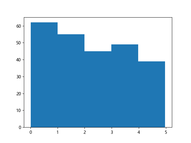 # 使我们的编译器能够绘制的三行代码: import sys import matplotlib matplotlib.use('Agg') import numpy import matplotlib.pyplot as plt x = numpy.random.uniform(0.0, 5.0, 250) plt.hist(x, 5) plt.show() # 使我们的编译器能够绘制的两行代码: plt.savefig(sys.stdout.buffer) sys.stdout.flush()