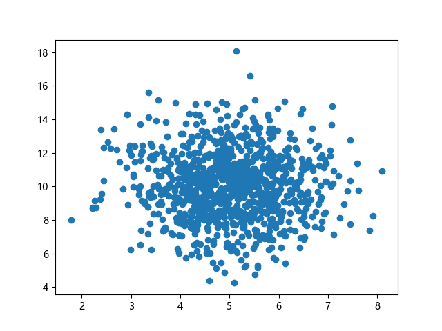 # 三行配置使编译器支持绘图功能: import sys import matplotlib matplotlib.use('Agg') import numpy import matplotlib.pyplot as plt # 生成正态分布数据:x~N(5.0,1.0),y~N(10.0,2.0),各 1000 个样本点: x = numpy.random.normal(5.0, 1.0, 1000) y = numpy.random.normal(10.0, 2.0, 1000) # 绘制散点图 plt.scatter(x, y) plt.show() # 两行代码实现图形输出: plt.savefig(sys.stdout.buffer) sys.stdout.flush()