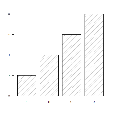 # 我们需要这行代码才能在编译器中显示图表 png(filename="output.png") x <- c("A", "B", "C", "D") # x 轴的值 y <- c(2, 4, 6, 8) # y 轴的值 # 绘制条形图,使用 y 轴的值,并用 x 轴的值作为条形的标签,条形填充为密度为 10 的阴影线 barplot(y, names.arg = x, density = 10)