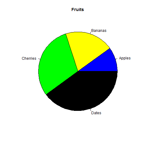 # 我们需要这行代码才能在编译器中显示图表 png(filename="output.png") # 创建一个饼图数据的向量 x <- c(10,20,30,40) # 创建一个标签向量 mylabel <- c("Apples", "Bananas", "Cherries", "Dates") # 创建一个颜色向量 colors <- c("blue", "yellow", "green", "black") # 绘制饼图,并添加标签、标题和颜色 pie(x, label = mylabel, main = "Fruits", col = colors)